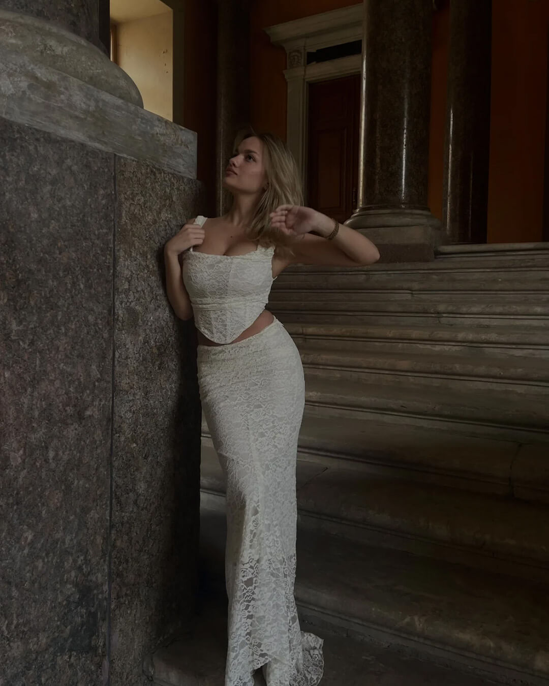 Step into elegance with the Esmeralda Lace Maxi Skirt Set, a breathtaking two-piece ensemble designed for the modern romantic. This stunning set features a delicate lace-up crop top with built-in boning for superior support and a flowing, double-layered maxi skirt that dances with every step. Perfect for capturing the essence of spring garden parties or golden summer sunsets, its intricate lace detailing and slim-fit silhouette exude sophistication. Whether you're attending a high-end wedding, celebrating a milestone birthday, or strolling along a Mediterranean coast, the Esmeralda set ensures you are the center of attention. Experience the perfect blend of luxury and comfort with high-quality, breathable fabric that transitions effortlessly from daytime charm to evening glamour. Elevate your wardrobe with this transseasonal masterpiece and embrace a look that is as unforgettable as the occasion itself.